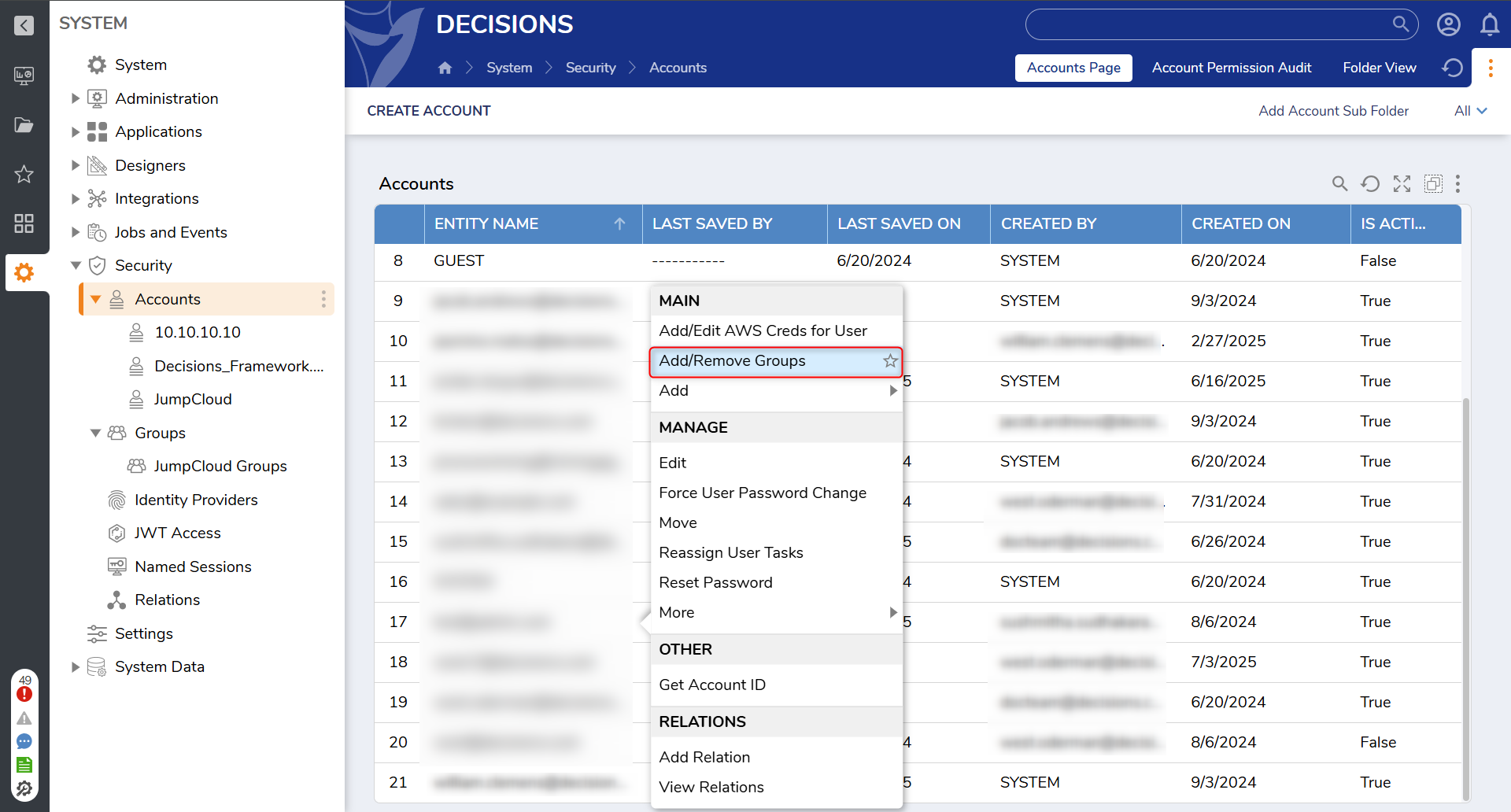 1 Navigate to System > Security > Accounts. In this menu, all accounts on the server are present.