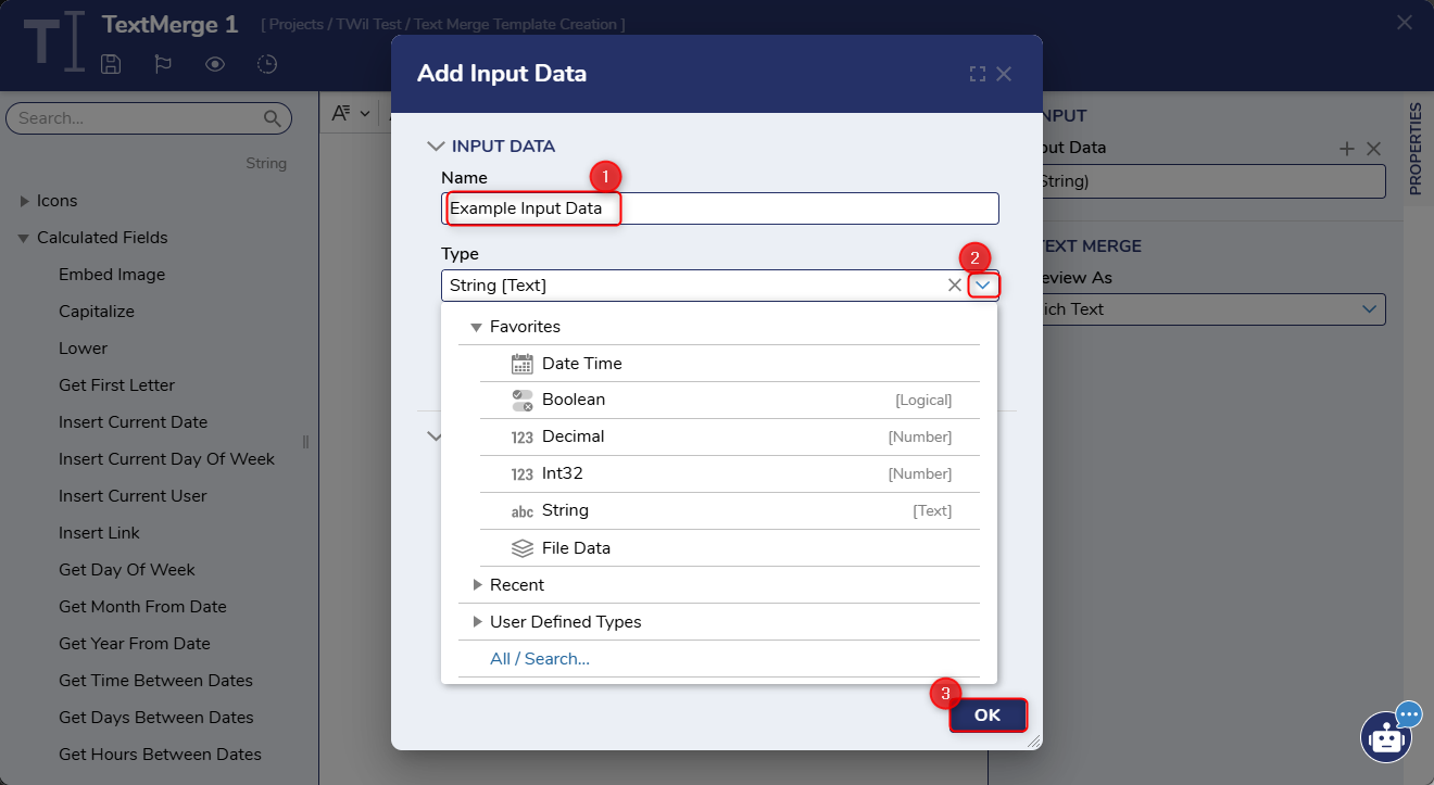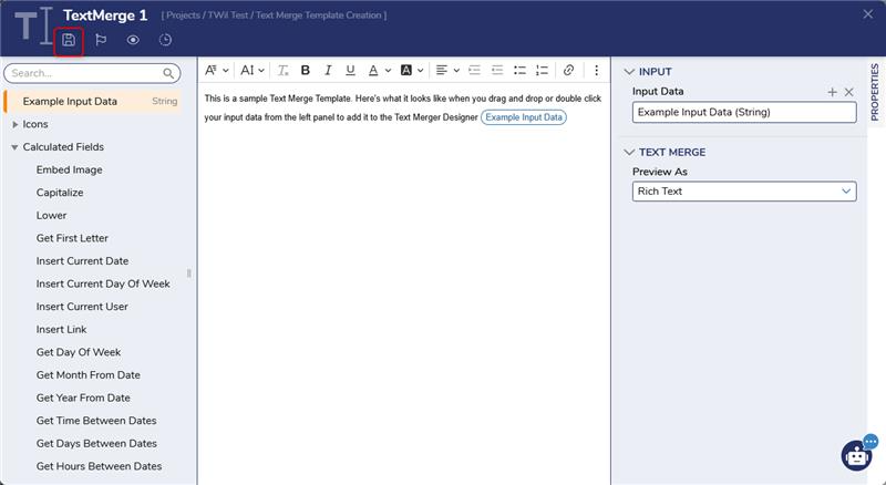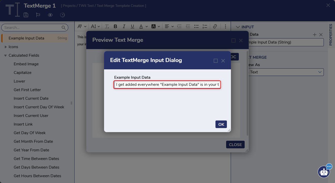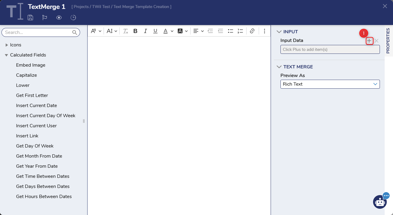 The Text Merge Designer will open. Under "Input Data" Click the + to add input fields (e.g., Name, Email).