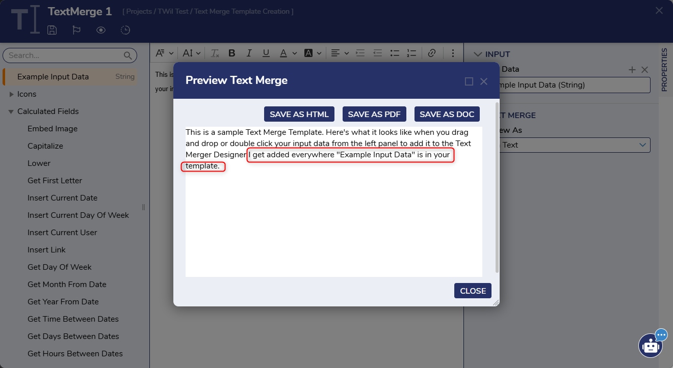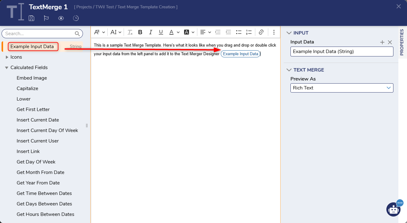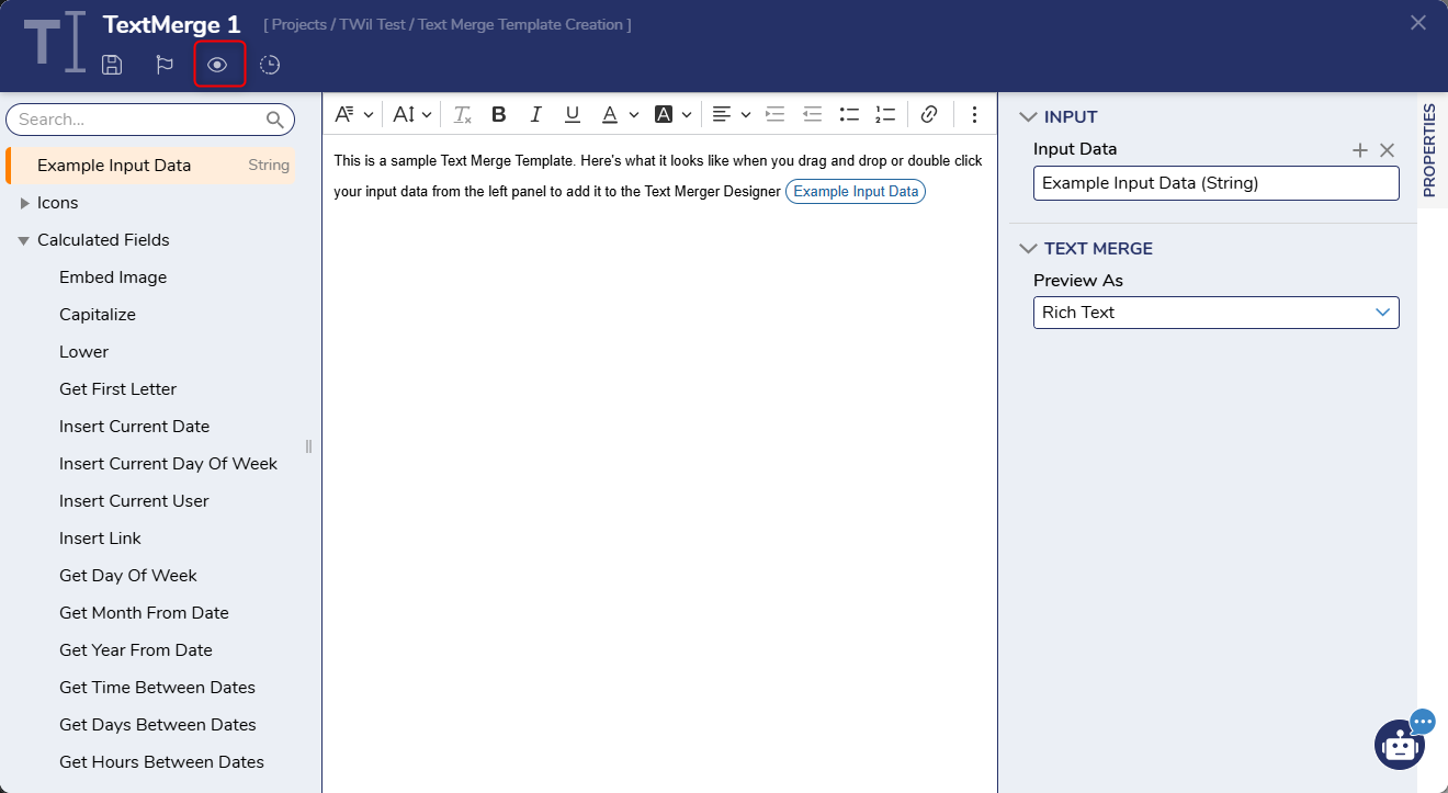 Give values for your Input Data to see them displayed in the Text Merger Designer.