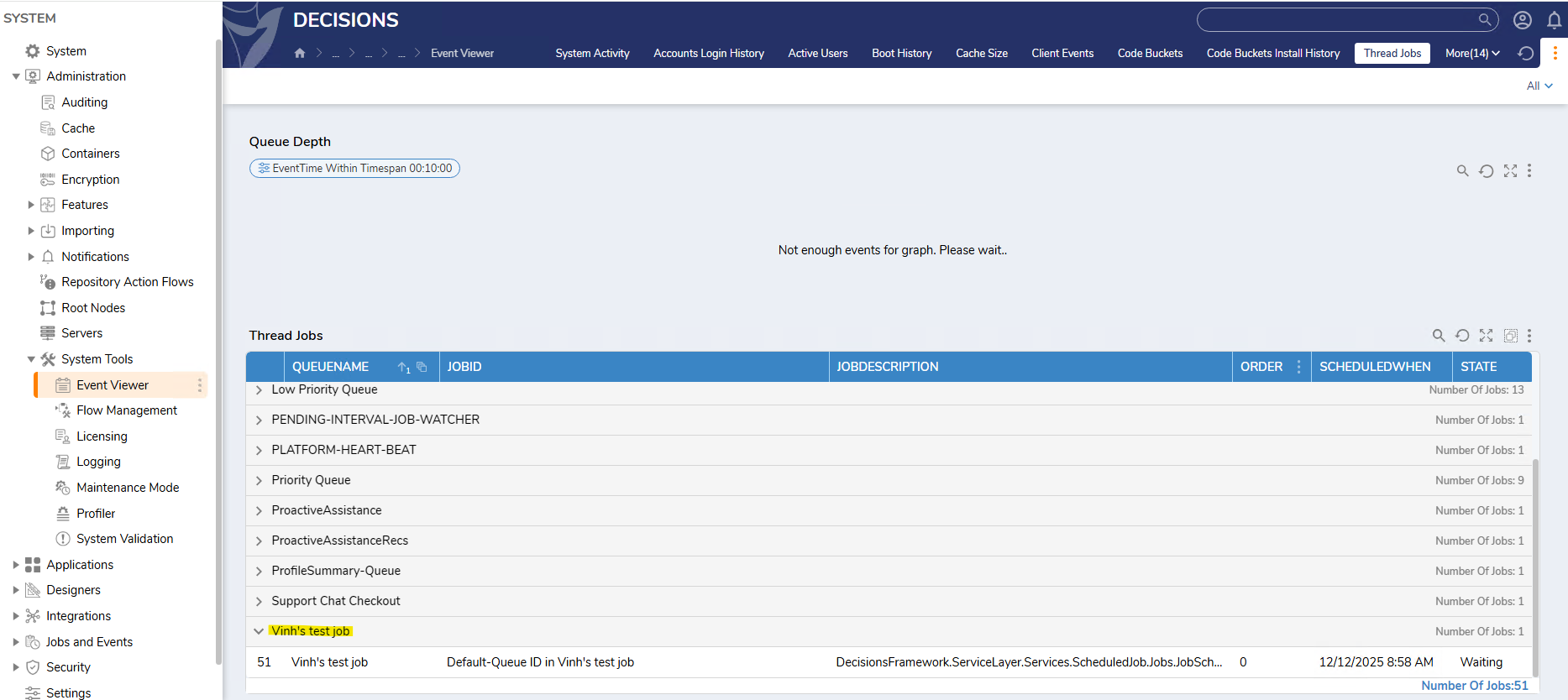 Thank you for reaching out on our forum! Regarding your first question, you can view the jobs with specified queue names you created as well as default job queue names that are set up when you install Decisions by navigating to System > Administration > System Tools > Event Viewer > Thread Jobs. Below are screenshots of how to specify a job queue name as well as how it would look in the Thread Jobs dashboard.
