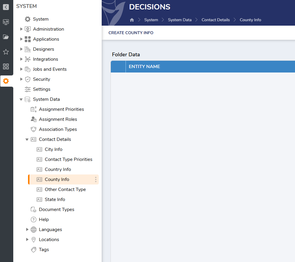 The CountyInfoService in the Internal Decisions Service step does not call any external service. It retrieves county data from "System Data > Contact Details > County Info" within Decisions. If you haven't configured or submitted data in that section, the service will return no results. It does not use the USPS module or any external lookup. To get results, you need to add county information directly into the system data area.