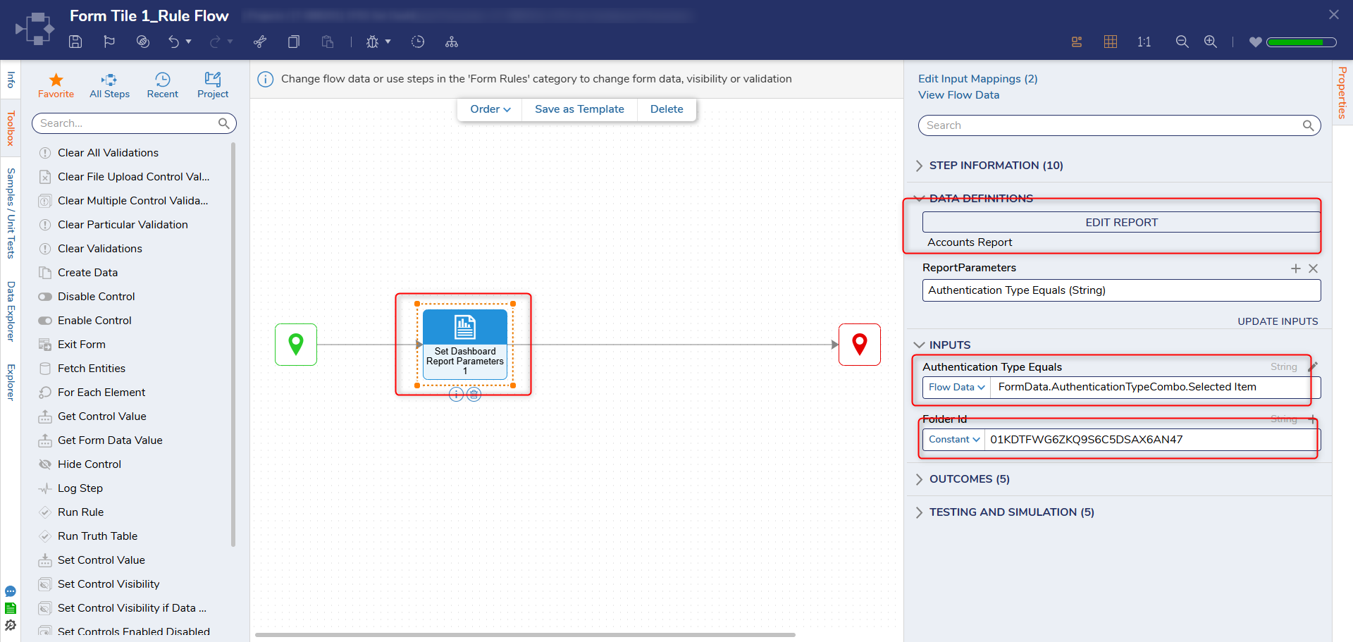 4)Inside AFF, add 'Set Dasboard Report Parameters' step.a) Select previously created report. This will creat an ReportParameter. Pass in the form fields selected value from FormData.b) Set Folder ID to ID of the page/dashboard.