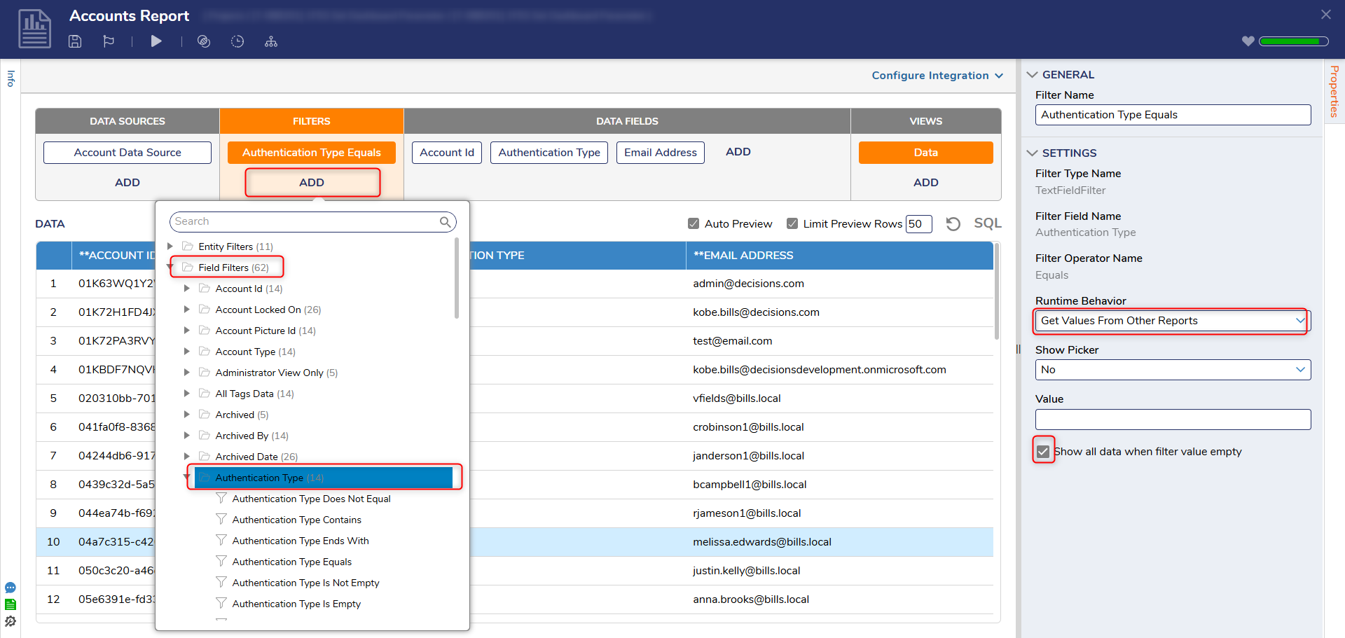 I have a report that on a page that contains currently active accounts. I need users to have the ability to select an authentication type to filter the report using a predetermined list. I have created a form tile where the type can be selected via a dropdown. However, I can not get the report to filter properly. Am I missing anything configuration wise to allow a report to be filtered using a file control?
