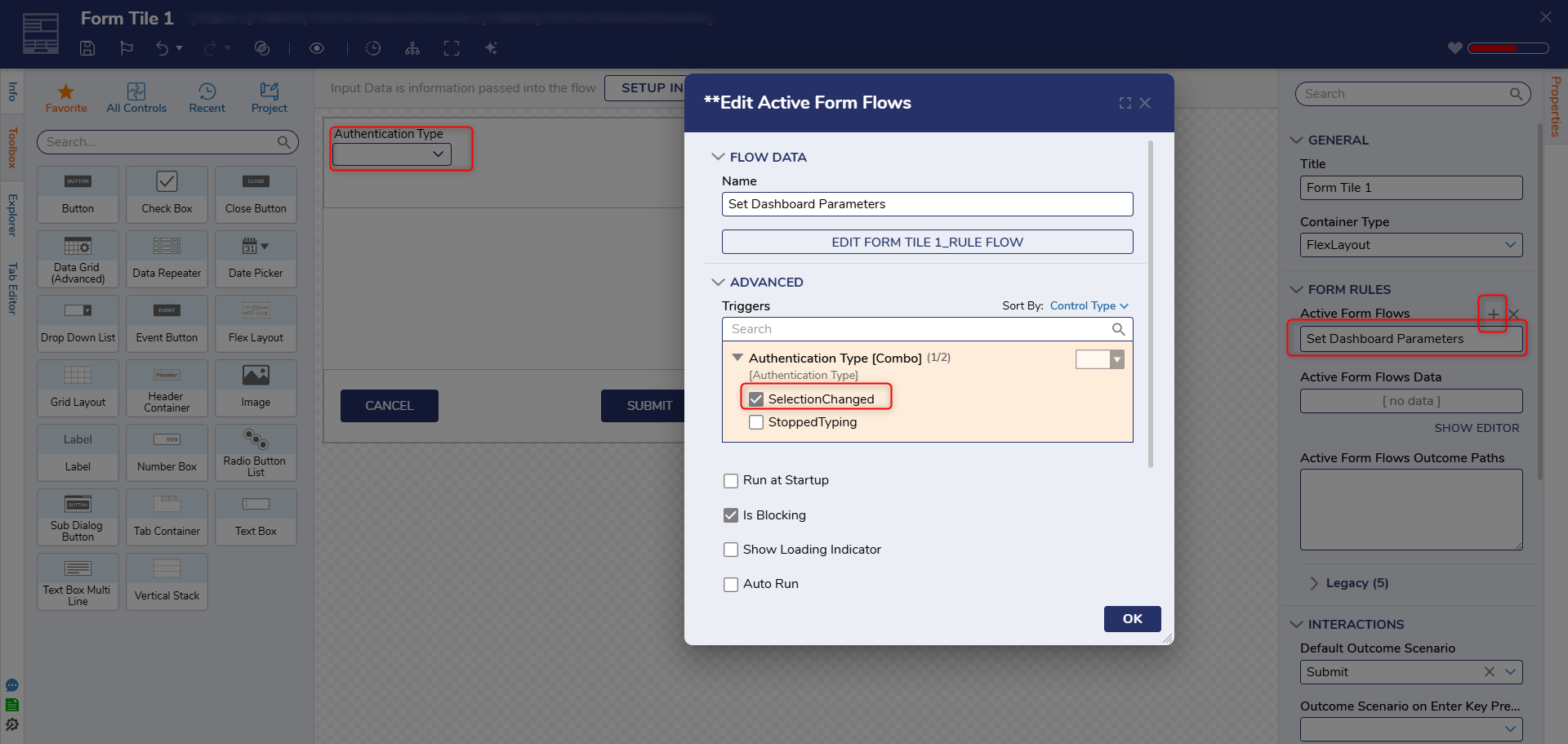 3)Create AFF in Form Tile Form under Properties > Form Rules > Active Form Flow and Set Trigger to 'SelectionChanged'