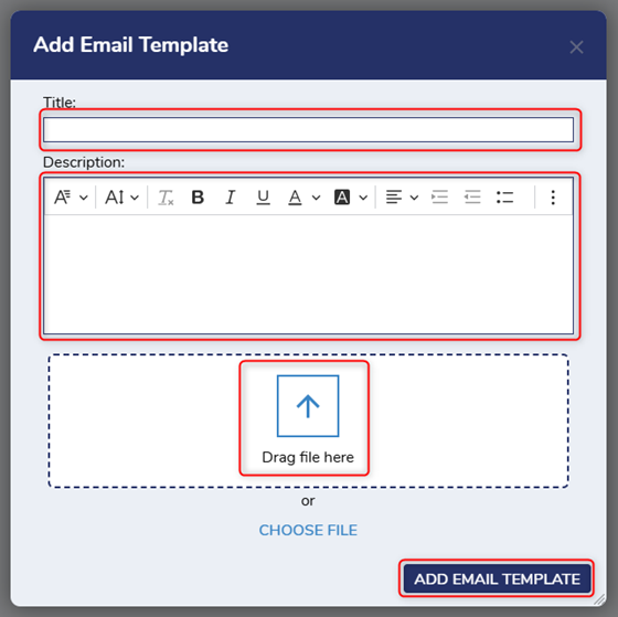 In the ‘Add Email Template’ window, enter a Title and Description, and then drop or choose the Email Template HTML document. Click ADD EMAIL TEMPLATE.