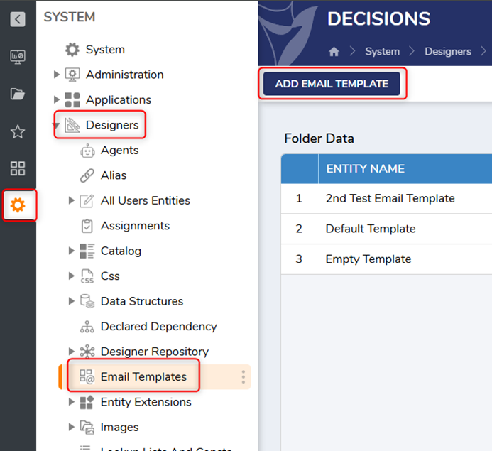 System >> Designers >> Manage >> Email Templates. Click ADD EMAIL TEMPLATE.