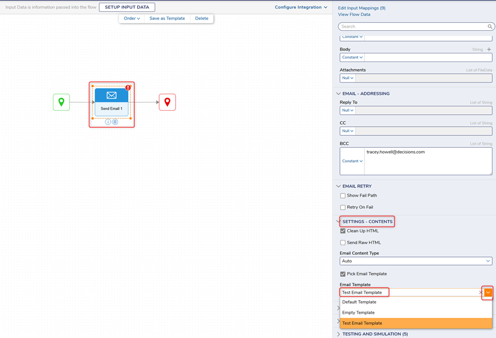 In the Flow Designer, select the Send Email step. In the step properties under Settings – Contents, from the Email Template drop-down menu, select the added Email Template. Click Save and close the Flow Designer. Note: Be sure to input From, To, Subject, and Body.