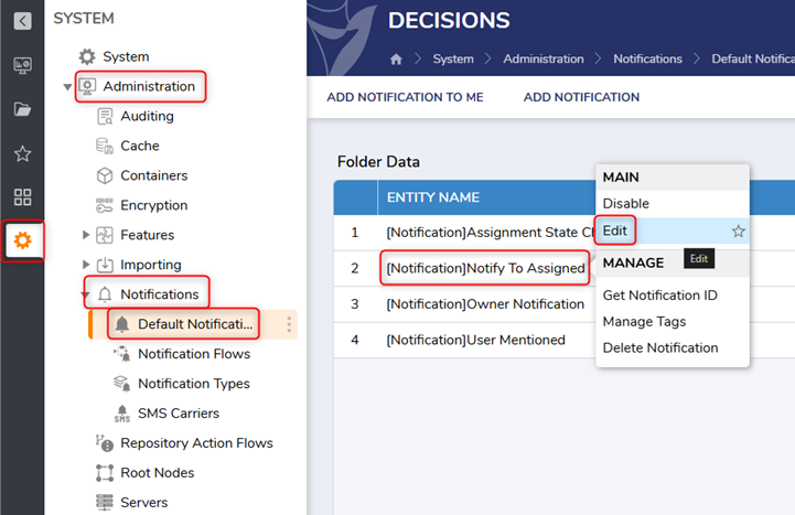 System >> Administration >> Notification >> Default Notification, and right-click [Notification]Notify To Assigned. Select Edit.