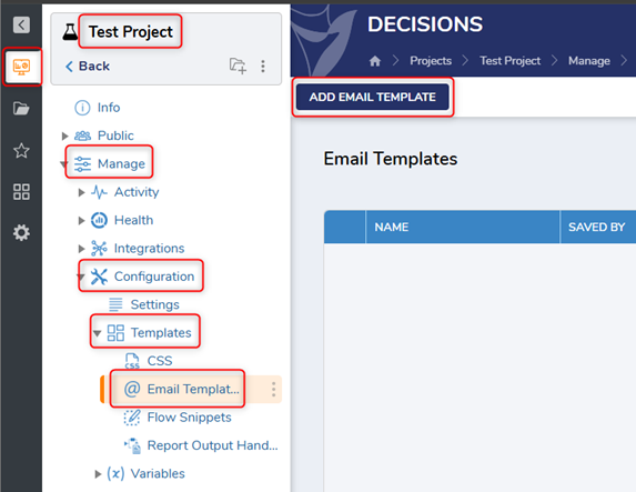 Projects >> Desired Project >> Manage >> Configuration >> Templates >> Email Templates. Click ADD EMAIL TEMPLATE.