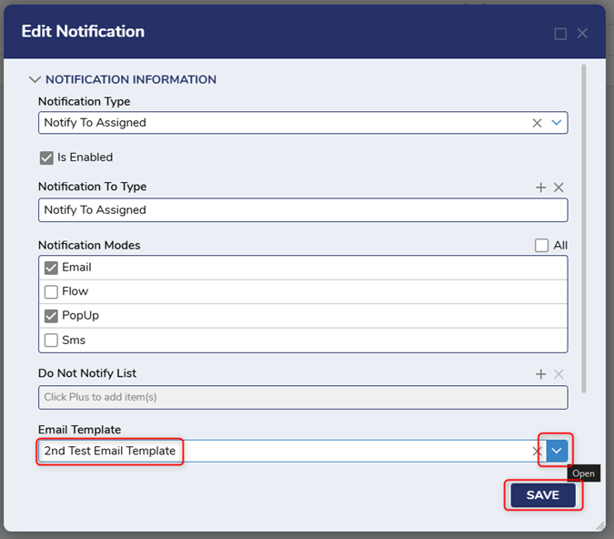 In the ‘Edit Notification’ window, for Email Template, select your custom HTML email template and click SAVE.