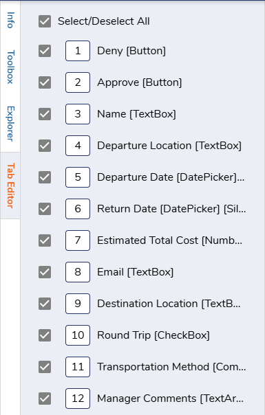 To select the order of tabbing simply label the form controls in order. If the user’s mouse is in form control number 1 in the tab editor, then when the user clicks tab it will go to form control 2 and so on. The numbers are originally given based on the order that form controls are placed in the form. But to configure it how you want, you do that through the tab editor.