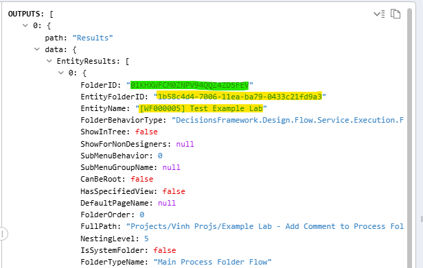 4. Make note of the 'FolderID' value highlighted in green as it will be needed5. Add another 'Fetch Entity' step and connect the previous fetch step to ita. Type Name = 'FolderState [DecisionsFramework.ServiceLayer.Services.Folder]'b. Fetch Criteriai. entityFolderID Containsc. INPUTSi. Map in the 'FolderID' in step 4 into 'entity Folder ID'ii. Leave 'Parent Folder Id' on ignore