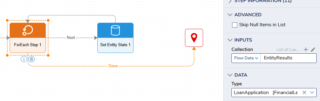 You will then want to add a ForEach Step. This will allow you to run a Set Entity State step on each item you fetched via the Fetch Entities Step. Within the ForEach Step you will want to set the Collection to your EntityResults (the Fetch Entities output) and set the Data Type to the case entity you are using.